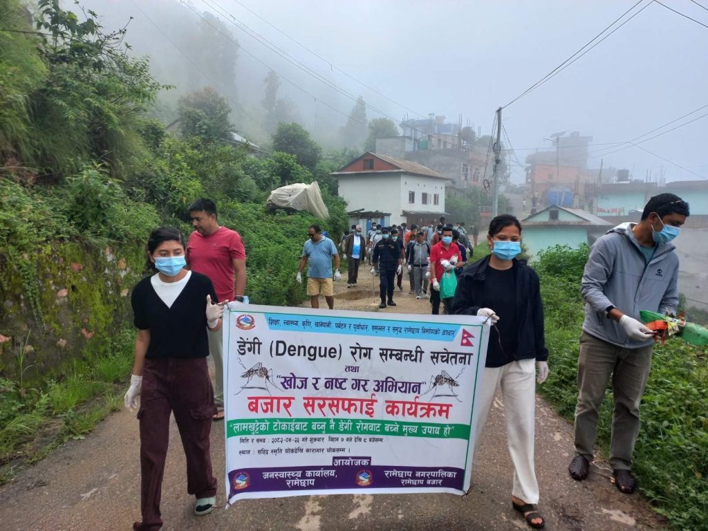 पानी परिरहने समय भएको हुँदा लामखुट्टेको टोकाइबाट हुने डेङ्गु रोग फैलन सक्ने भन्दै लार्भा खोज र नष्ट गर अभियानसँगै बजार सरसफाई गरिएको रामेछाप नगरपालिकाका जनस्वास्थ्य अधिकृत विष्णु बहादुर कार्कीले बताए ।